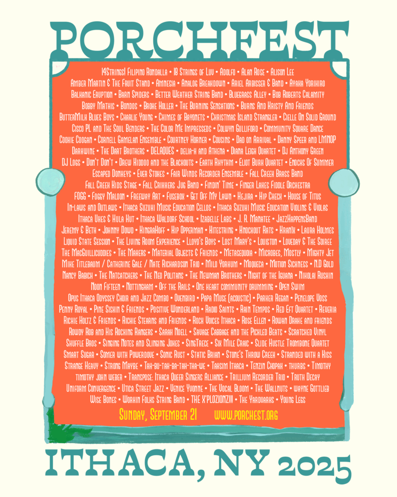 Join us on Sunday, Sept 22, from noon until 6 PM, for the 2024 edition of Porchfest, Ithaca’s beloved neighborhood music festival! Here’s everything you need to know….